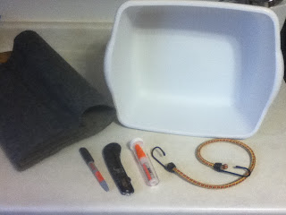 Step 1: Measure & cut 4 strips of the outdoor carpet. Make the strips 1.25 to 1.5 inches wide, and long enough to fit the width of the bottom of the dishpan. Use the outdoor carpet, the knife & perhaps the marker for this step, in case you're wondering...