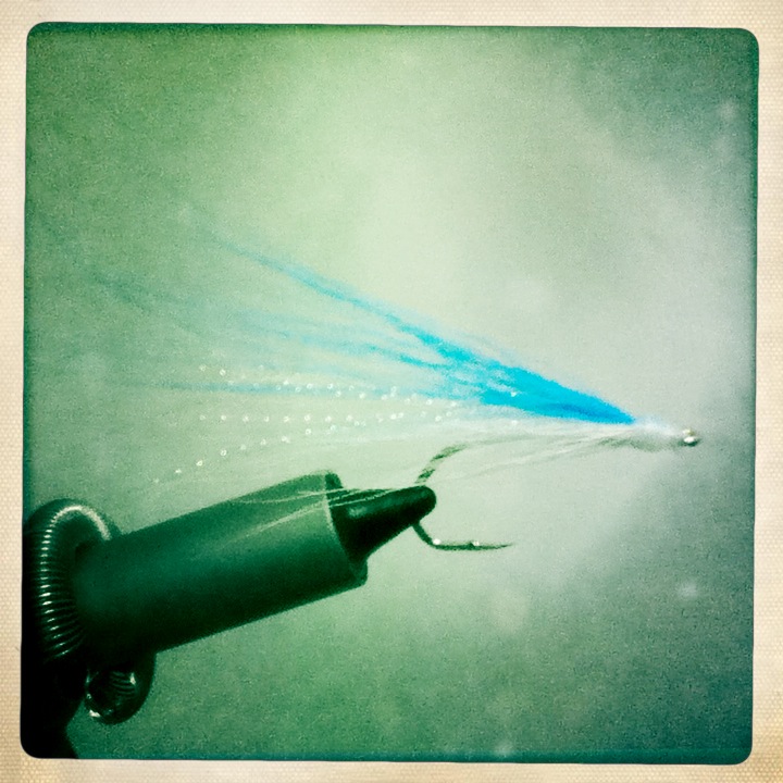 I brought a very small sample of tying material with me: bucktail, yak hair, marabou, crystal flash, thread, eyes, stainless steel hooks, head cement.